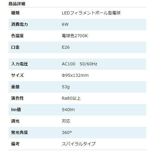商品詳細 種類 LEDフィラメントボール型電球 消費電力 6W 色温度 電球色2700K 口金 E26 入力電圧 AC100 50/60Hz サイズ Φ95x132mm 重量 53g 演色性 Ra80以上 lm値 540lm 調光 対応 発光角度 360° 備考 スパイラルタイプレトロで暖かなフィラメント電球がおしゃれ6W E26口金 LEDボール型電球 安いだけのフィラメント電球と違い【調光】にも対応しています もう少し暗くして雰囲気を出したいと思った時にやはり調光対応しているとうれしいですね。